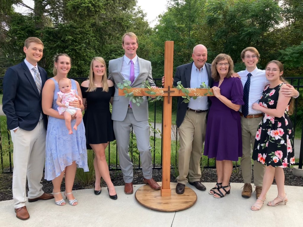 In our family picture, Jacob is wearing Mipps’ jacket and one of his ties; Joshua is sporting one of his ties as well. Our Dad made this beautiful cross centerpiece for the wedding ceremony.