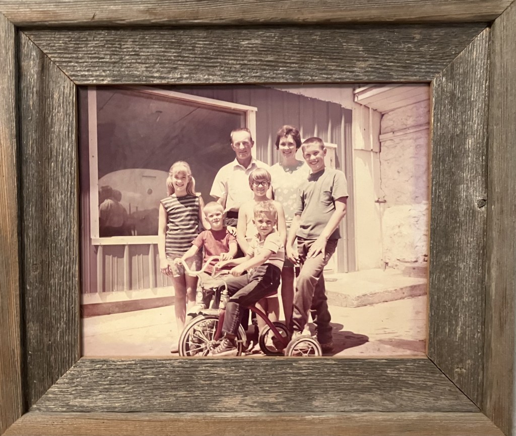 Mark (Mipps) grew up the last of five children to a farming family in Wayside, WI. I was seven when he arrived on the scene to complete and forever change the face of our family. He was a doll baby and my sister, Debra, and I had fun helping mom and dad raise him. Here we are in 1972 or so, the year that Dad won Outstanding Young Farmer for our state, in a professional shot in a frame dad handcrafted from old barn wood.