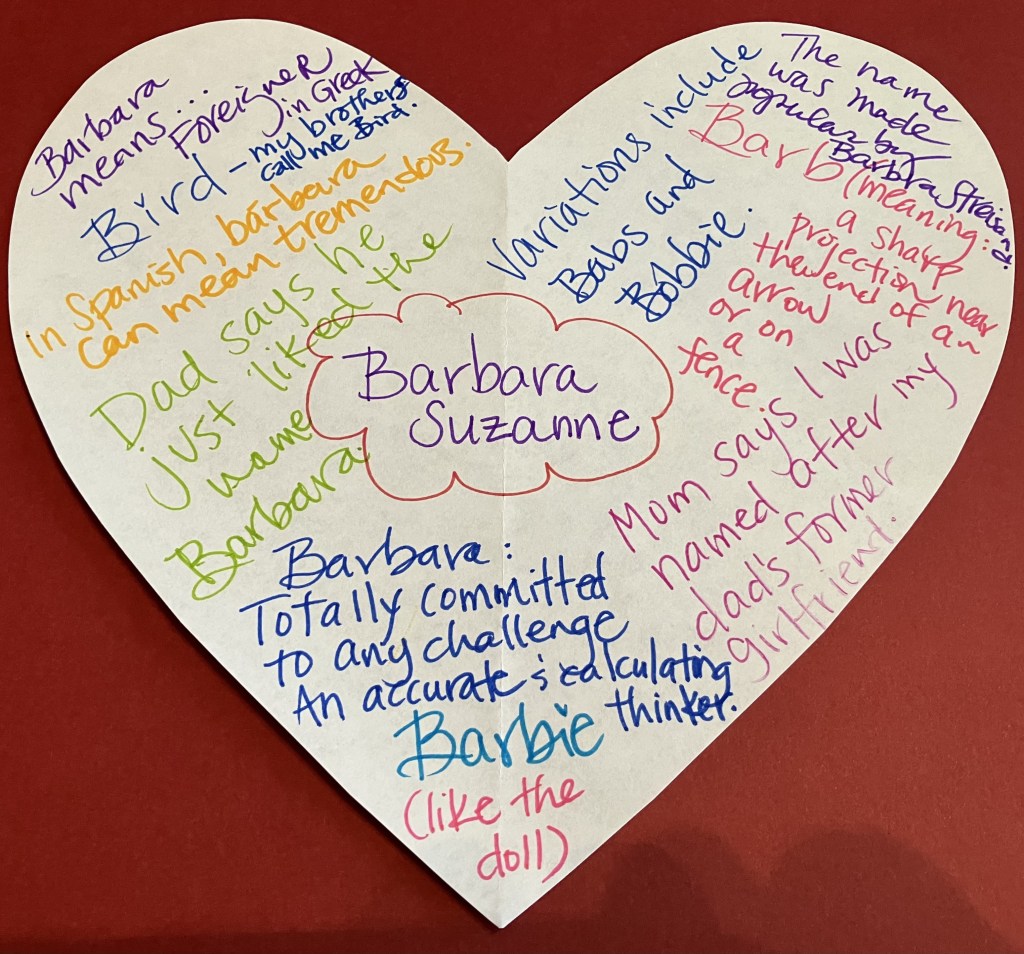 My heart is so happy, so today I’m encouraging you to create your own name’s Heart Map while you tune in to my most-recent podcast episode, a virtual-porch reflection on gratitude with my friend, author Barbara Bray