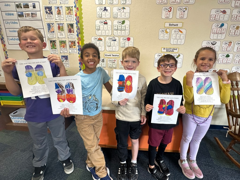 My cousin texted a photo of Owen’s color sheet after my visit to his school. I just love how he connected back to the story by finishing off his slippers with a pom of a different color.