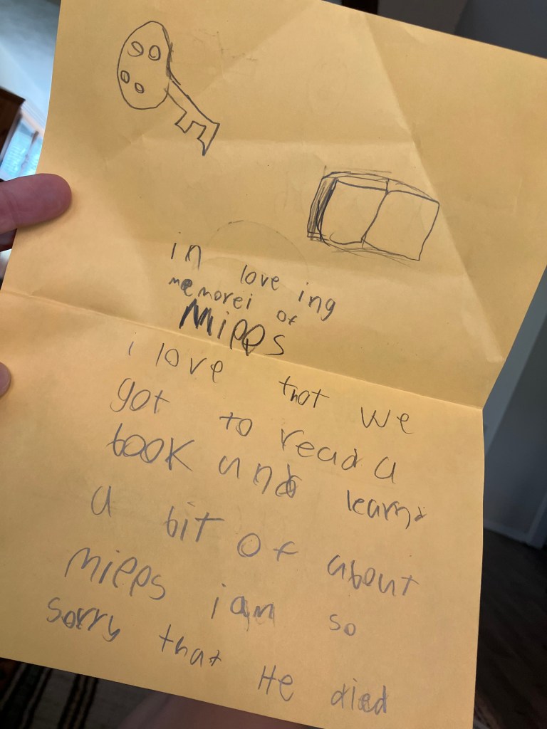 I left a copy for the class after our read-aloud; here we are, looking for Mipps’ given name, hidden within the text.