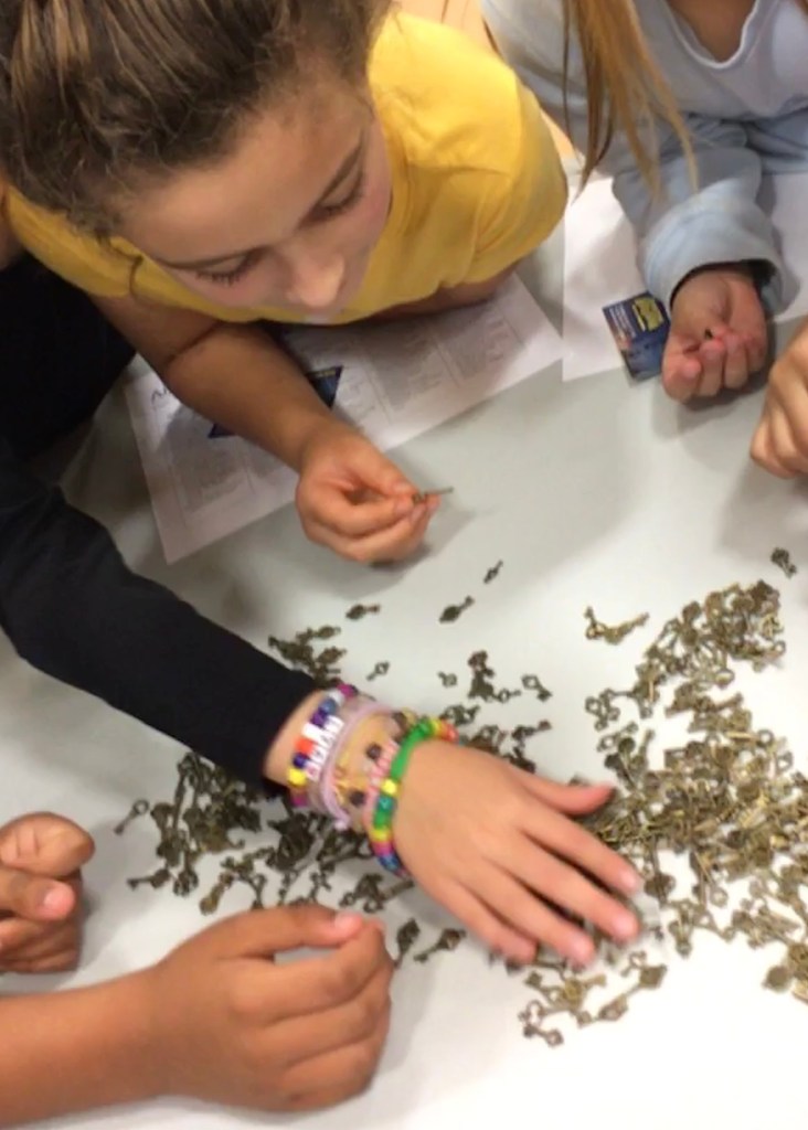 This evening, I spent time stringing 40 vintage keys for the first-grade classes on my next author visit.